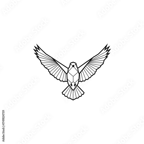 Naklejka premium Geometric bird in flight, wings spread, line art on white, simple and clean...