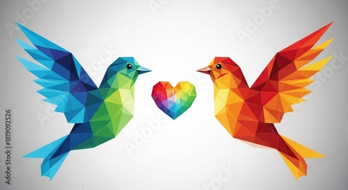 Obraz premium Geometric birds with colorful heart, abstract love concept