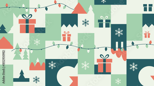 © Luqman, Naklejka premium Geometric Christmas holiday seamless pattern with gifts and trees.