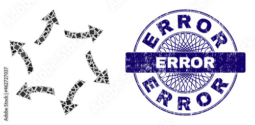 Fototapeta premium Geometric collage centrifugal arrows, and Error corroded stamp seal. Violet stamp seal has Error text inside circle form. Vector centrifugal arrows collage is organized of randomized circle, triangle,