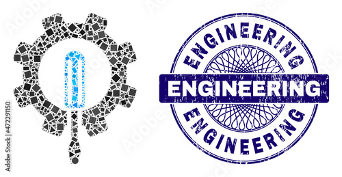 Fototapeta premium Geometric collage engineering, and Engineering rubber seal print. Blue seal has Engineering text inside round shape. Vector engineering mosaic is created of scattered round, triangle, square parts.