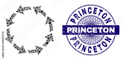 Fototapeta premium Geometric collage rotate ccw, and Princeton rubber seal print. Violet seal has Princeton title inside round form. Vector rotate ccw collage is formed with different spheric, triangle, rectangle items.