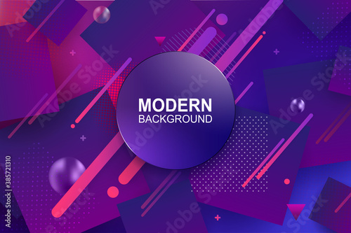© altadi, Fototapeta premium Geometric composition with a gradient of blue and purple shades, a round blue frame, a set of squares and stripes
