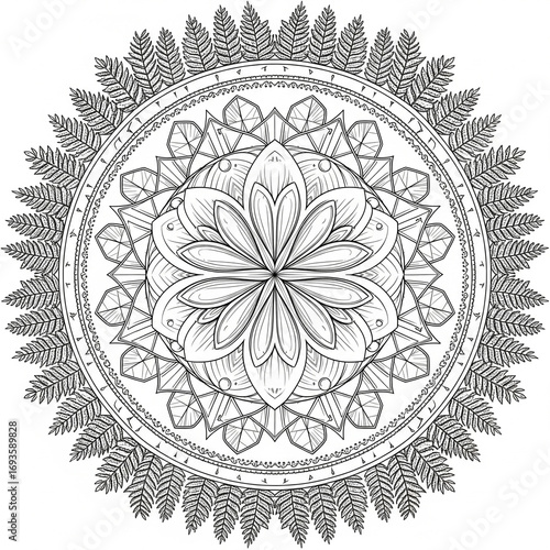 © TerraStudio, Fototapeta premium Geometric Crystal Flower Mandala with Dodecahedron Center – Black and White Coloring Page