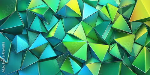 © Oleksandr, Obraz premium Geometric 3D triangular background. Abstract 3D Triangular Green and Metallic Blue Banner
