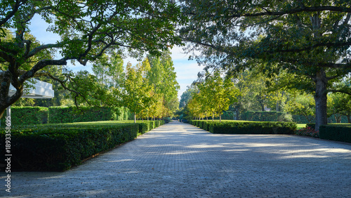 Fototapeta premium Geometric Garden Allée with Trimmed Hedges and Trees