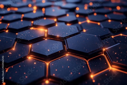 © ChaoticMind, Obraz premium Geometric hexagonal pattern with glowing orange lines on a dark textured surface