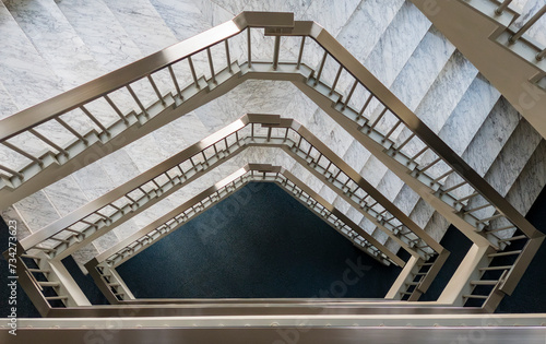 © Fredy Ferreri, Obraz premium Geometric metal staircase with white marble treads in an office building
