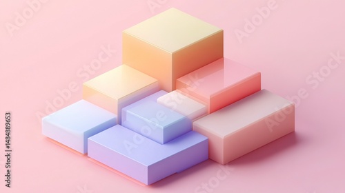 Obraz premium Geometric minimalist composition with cascading semi-transparent shapes in soft gradient transitions, rendered in modern 3D isometric style. Abstract background with clean lines and elegant design