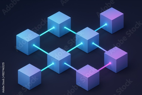 © Leo Rohmann, Obraz premium Geometric network connections showcasing dynamic blockchain technology represented with glowing cubes and neon lighting in a digital landscape