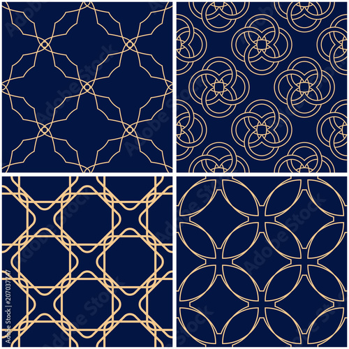 Fototapeta premium Geometric patterns. Set of golden blue seamless backgrounds