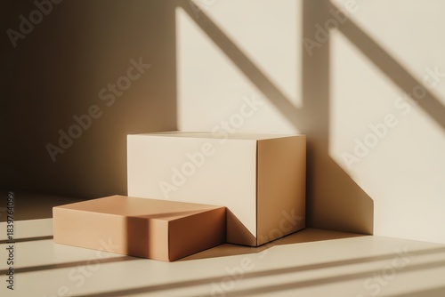 © NUR ISLAM STORE, Fototapeta premium Geometric product display, minimalist podiums with light, shadows.