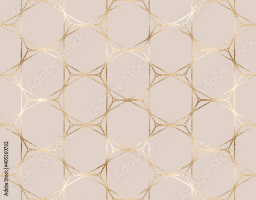 © NikaMooni, Naklejka premium Geometric seamless pattern gold rounded hexagon grid tiles.