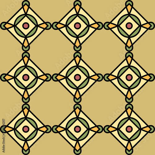 Naklejka premium Geometric seamless tile pattern with golden ornament, textile, rug, graphic, earthy tones.