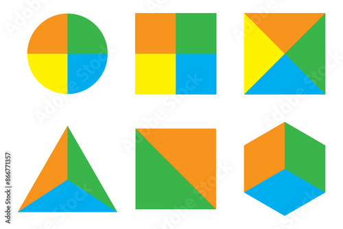© Полякевич Олена, Obraz premium Geometric shape icons. Colorful divided forms. Circle, square, triangle. Vector illustration set.