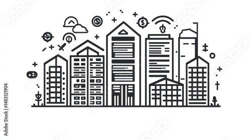 © Mufarokah, Fototapeta premium Geometric skyline with various building sizes and symbolic elements floating
