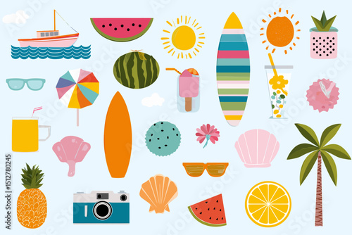 Fototapeta premium Geometric Summer Vacation Icons � Minimalist Beach, Boat, and Tropical Elements for Holiday Designs