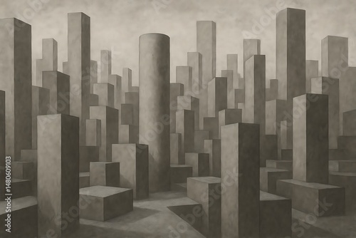 Fototapeta premium Geometric urban cityscape with a series of concrete blocks and cylindrical...