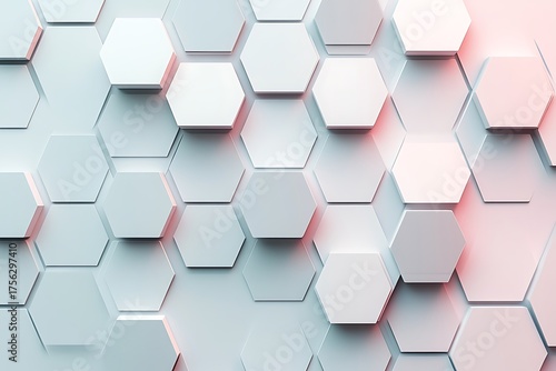 © Mahmud Creative, Fototapeta premium Geometric white hexagon tiles with soft pink glow abstract technology design element