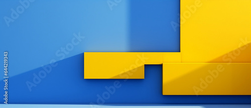 © yeseyes9, Obraz premium Geometryczne żółte kształty na niebieskiej ścianie z cieniem. Przestrzenne tło do baneru oraz prezentacji produktu.
