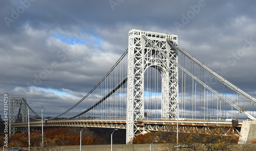 Fototapeta premium George Washington Bridge, double-decked suspension bridge spanning Hudson River against background of dark clouds. New York City, United States