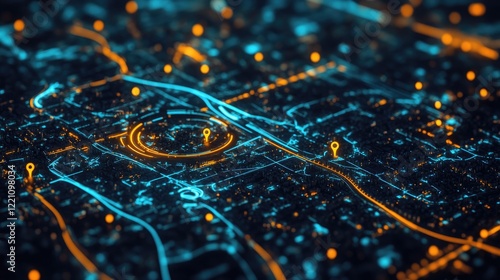 Fototapeta premium Geospatial intelligence and logistics management visualized on a city map, with location pins marking delivery and transport points.