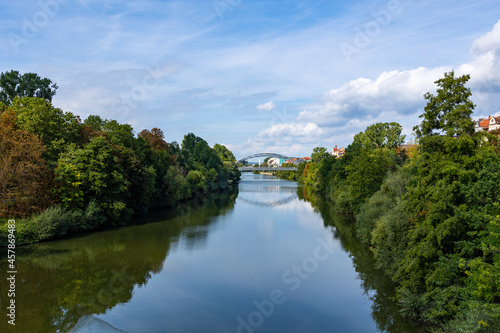 Fototapeta premium 13.09.2021, GER, Bayern, Bamberg: Blick von der Marienbrücke auf die Luitpoldbrücke über den Fluss Regnitz.