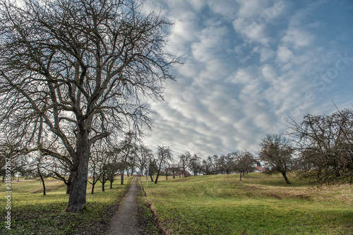 © lebaer, Obraz premium Geradliniger Fußweg zerschneidet Baumwiese vor Wolkenhimmel