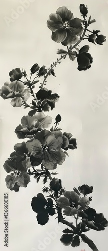 Naklejka premium Geranium arrangement in Japanese ink painting style, minimalist composition, black ink on textured rice paper, zen aesthetic, gentle brush strokes, signature.
