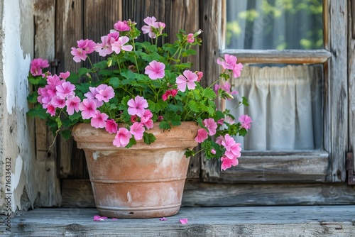Fototapeta premium Geranium flowers in planter on a patio of an old house with rustic decor.
