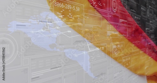 Naklejka premium German flag draping diagonally over holographic map in data center, with...