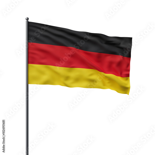 © ImageFlow, Naklejka premium German flag in black, red, and yellow colors waving on a pole, on a white background. Concept of patriotism, national pride, and celebration. 3D Rendering.