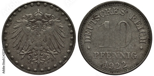 Fototapeta premium German Germany iron coin 10 ten pfennig 1922, Weimar Republic, imperial eagle within circle of large dots, value and date,