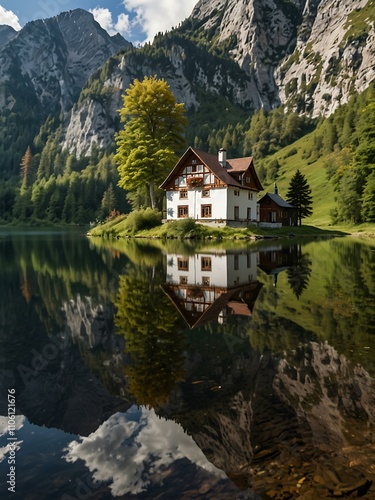 Fototapeta premium German lodge reflected in Lake Obersee.