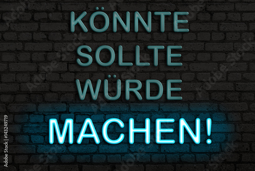 © timyee, Obraz premium German motivation concept "Könnte, sollte, würde, machen!" (Could, should, would, do!) as Neon writings on Brick Wall