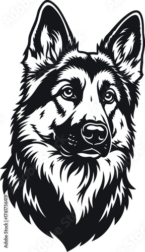 © AMnest, Naklejka premium German Shepherd Dog Head Vector Portrait. Black and White Monochromatic Illustration for Logo, Decal, or T-shirt Print