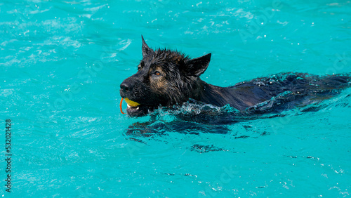© LDC, Fototapeta premium german shepherd dog swimming in the pool with a ball in his mouth. Happy dog in water. Happy Dog swimming