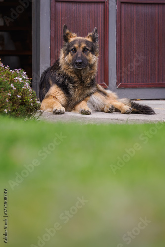 © lapis2380, Fototapeta premium German Shepherd lying outdoors by a door on concrete behind grass.