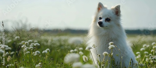 Fototapeta premium German Spitz dog with white fur in a meadow setting with copy space image