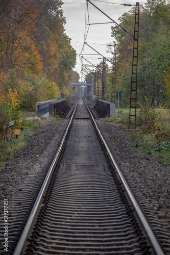 © 2199_de, Fototapeta premium Germany,Autumnal view of a single-track electrified railway line with a bridge