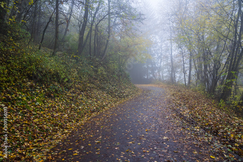 Fototapeta premium Germany, Curved trail inside foggy mystical forest in autumn season in the...