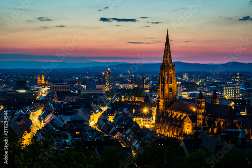 © Simon Dux Media, Naklejka premium Germany, Enchanted romantic sunset light over city freiburg im breisgau in baden