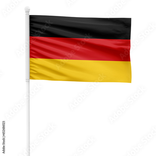 © Kooh Studio, Naklejka premium Germany flag isolated on cutout background. Waving the Germany flag on a white metal pole.