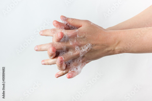 © projectio, Fototapeta premium gesture of woman washing her hands on white background