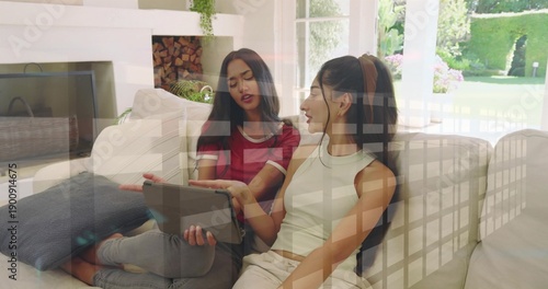 Fototapeta premium Gesturing, two women in living room holding tablet and leaning on sofa, glass...