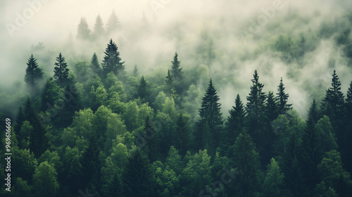 Fototapeta premium Gęsty las, w którym drzewa znikają w mglistym obłoku, tworząc tajemniczą i eteryczną atmosferę.