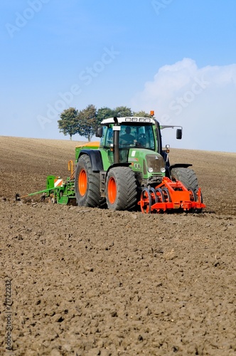 Fototapeta premium Getreideanbau -Schlepper mit Sämaschine am Hang