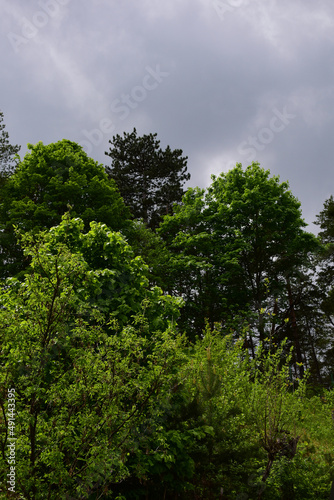 Obraz premium Gewitterstimmung im Mai mit hellgrünen, frischen Bäumen und grauem Himmel