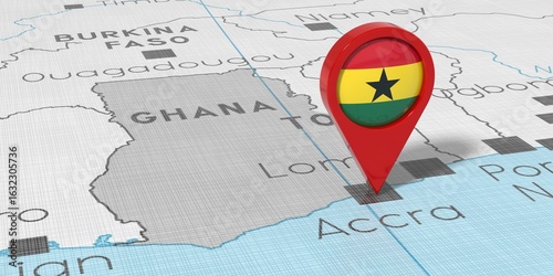 © PX Media, Fototapeta premium Ghana, Accra - location pin with national flag on political map - 3D illustration