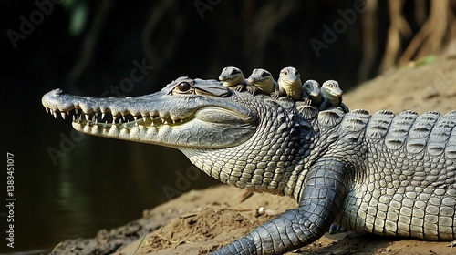 Naklejka premium Gharial crocodile basking Indian riverbank slender snout hatchlings riding on...